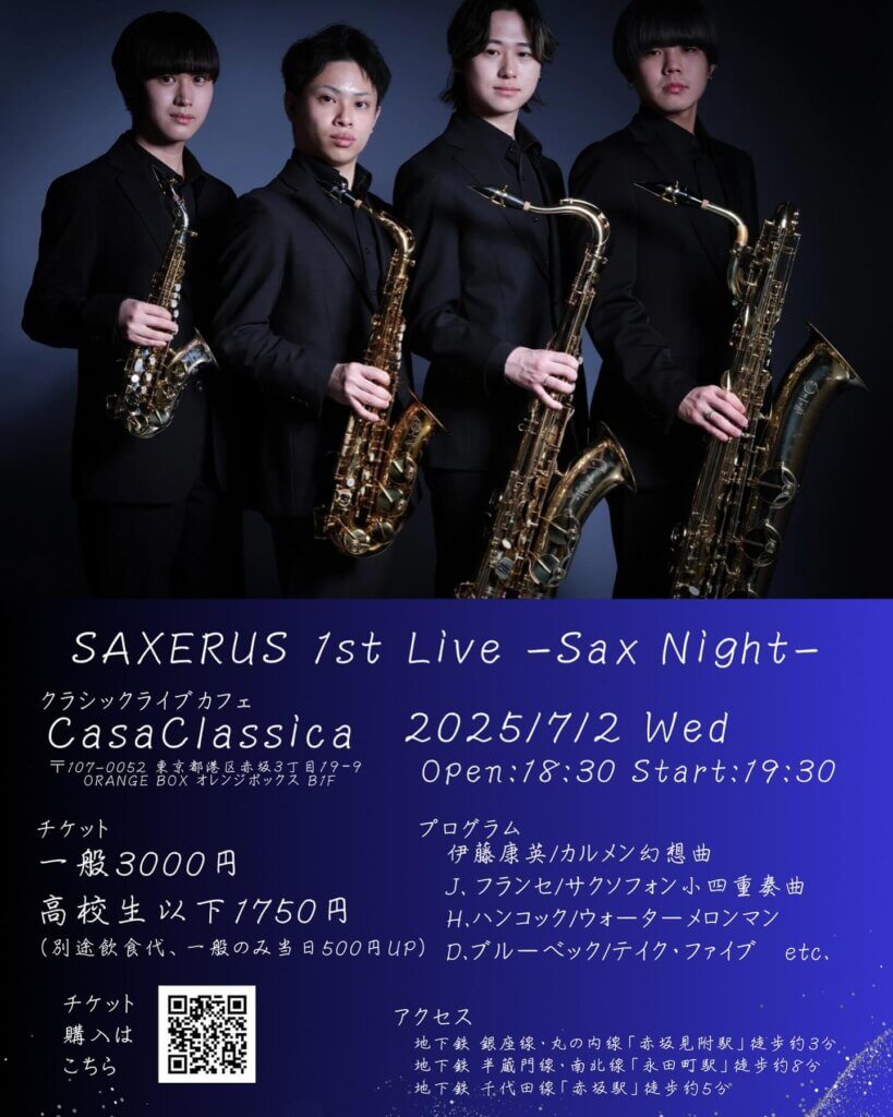 【SAXERUS 1st Live ―Sax Night―】 【日付】2025年7月2日(水)【会場】クラシックライブカフェ CasaClassica 【開場】18:30【開演】19:30【チケット】3,000円/ 高校生以下1,750円 (別途飲食代、一般のみ当日500円UP) -