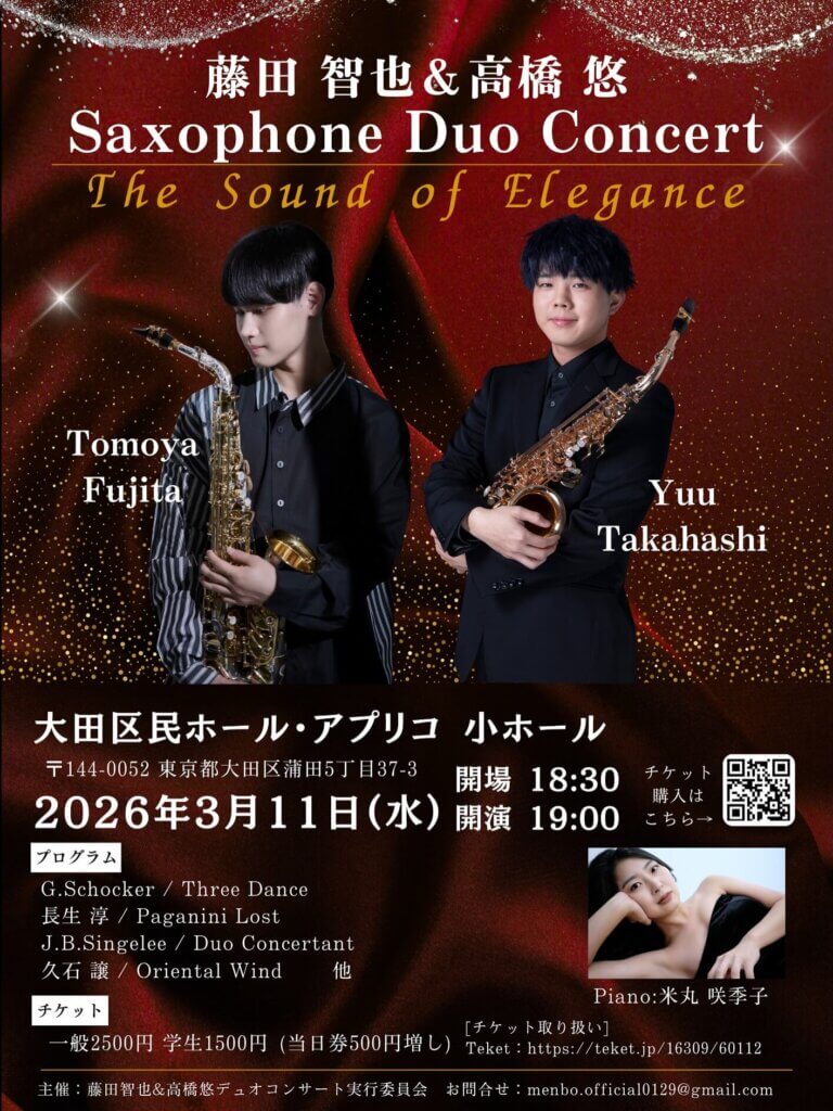 【藤田智也&高橋悠 サクソフォンデュオコンサート 〜The Sound of Elegance〜 開催決定!】 【日付】2026年3月11日(水)【会場】大田区民ホール・アプリコ 小ホール 【開場】18:30【開演】19:00【チケット】一般:2,500円 学生:1,500円 (当日券+500円) -